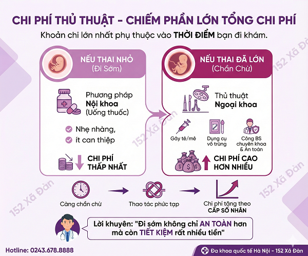 - Còn nếu thai đã lớn: Khi đó buộc phải chuyển sang thủ thuật ngoại khoa. Và chi phí không chỉ là tiền thủ thuật mà bao gồm rất nhiều yếu tố an toàn đi kèm như thuốc gây tê/ gây mê, dụng cụ vô trùng dùng 1 lần và đặc biệt là tay nghề của bác sĩ chuyên khoa – người trực tiếp thực hiện cũng như chịu trách nhiệm bảo vệ an toàn cho bạn.