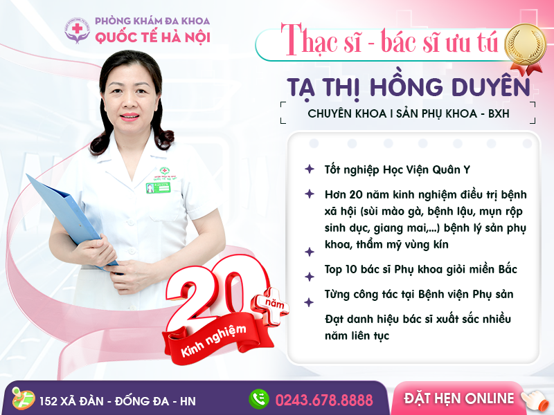 Bác sĩ Ưu tú Tạ Thị Hồng Duyên: Chuyên khoa Phụ sản có hơn 20 năm kinh nghiệm khám chữa bệnh phụ khoa, chăm sóc sức khỏe cho chị em phụ nữ. Bác sĩ luôn tư vấn phương pháp phù hợp nhất với tình trạng sức khỏe, đảm bảo bảo vệ tối đa khả năng sinh sản sau này.