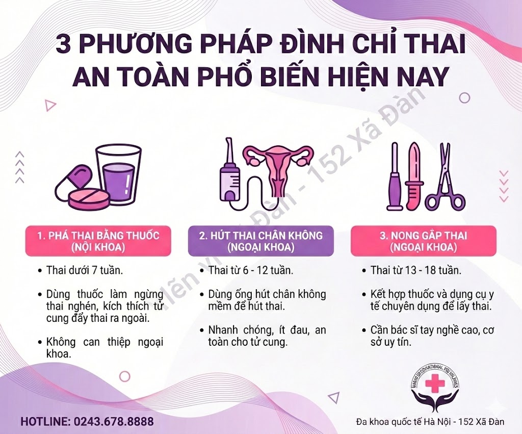 Chỉ khi có đầy đủ những thông tin này, bác sĩ mới có thể chỉ định phương pháp phù hợp và an toàn nhất. Trong quá trình tư vấn, bác sĩ sẽ giải thích rõ ràng rằng hiện nay có 3 nhóm phương pháp đình chỉ thai phổ biến, mỗi phương pháp chỉ phù hợp với một giai đoạn thai nhất định bao gồm: