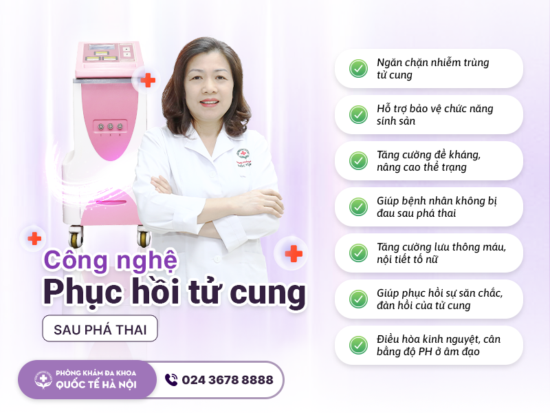 Các thiết bị y tế đều được nhập khẩu từ các quốc gia có nền y học hàng đầu thế giới (Mỹ, Đức, Hàn Quốc,…). Phương pháp đình chỉ thai được Bộ Y tế cấp phép hoạt động. Đối với thai 9 tuần tuổi, phòng khám Đa khoa Quốc tế Hà Nội áp dụng hút thai chân không. Sau phá thai, phòng khám áp dụng công nghệ phục hồi tử cung HOÀN TOÀN MIỄN PHÍ cho bệnh nhân. Đây là phương pháp hồi phục hiện đại, giúp lưu thông tuần hoàn, cân bằng nội tiết, điều hòa kinh nguyệt, ngăn ngừa nhiễm trùng sau phá thai. Hạn chế tối đa rủi ro tổn thương tử cung, bảo vệ chức năng làm mẹ cho phụ nữ.