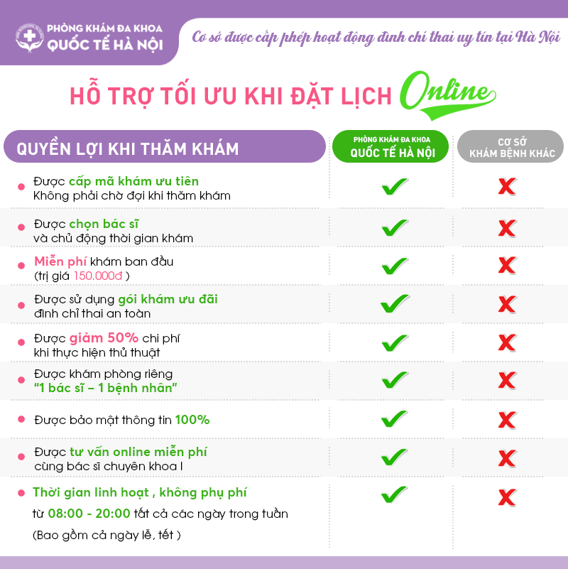 Ngoài việc áp dụng phương pháp tiên tiến vào đình chỉ thai an toàn, Đa Khoa Quốc Tế Hà Nội còn hội tụ nhiều ưu điểm vượt trội khác như: