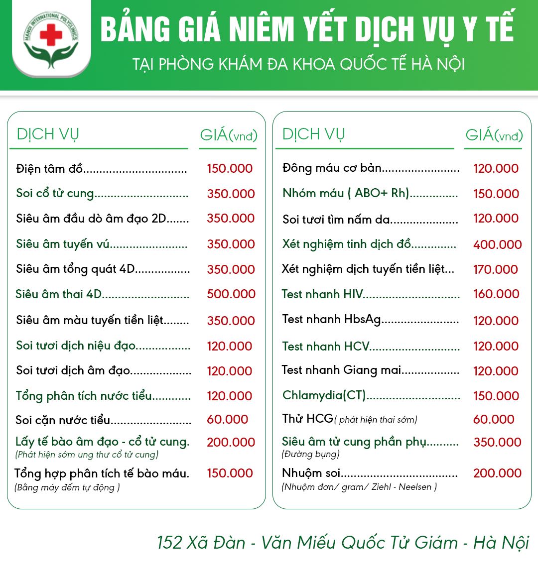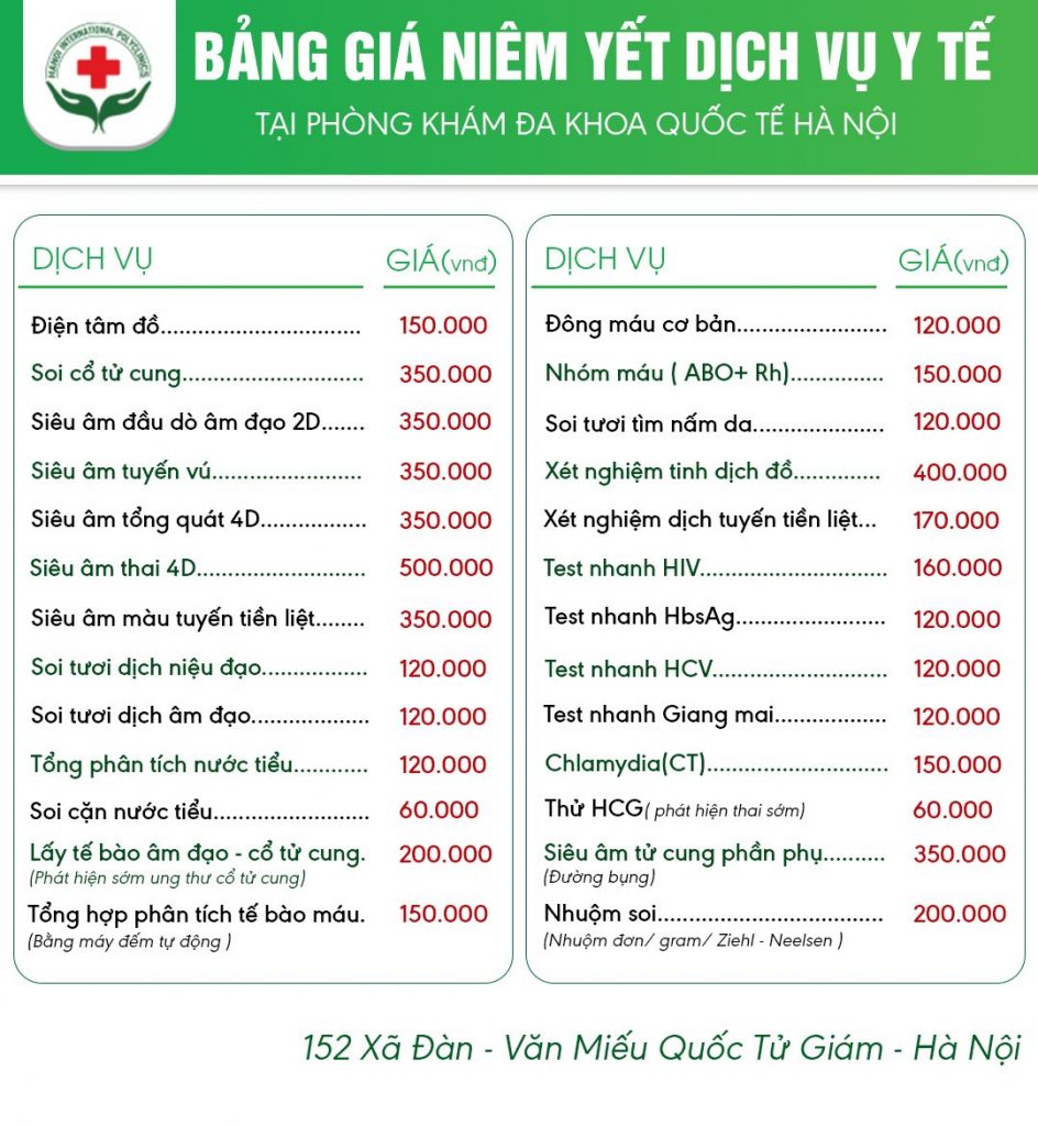 Phí thăm khám lâm sàng : Tại bệnh viện phí khám lâm sàng khoảng 300.000đ – 500.000đ. Nhưng tại Đa Khoa Quốc Tế Hà Nội, khi đặt hẹn trước [Tại đây] sẽ được MIỄN PHÍ 100%.